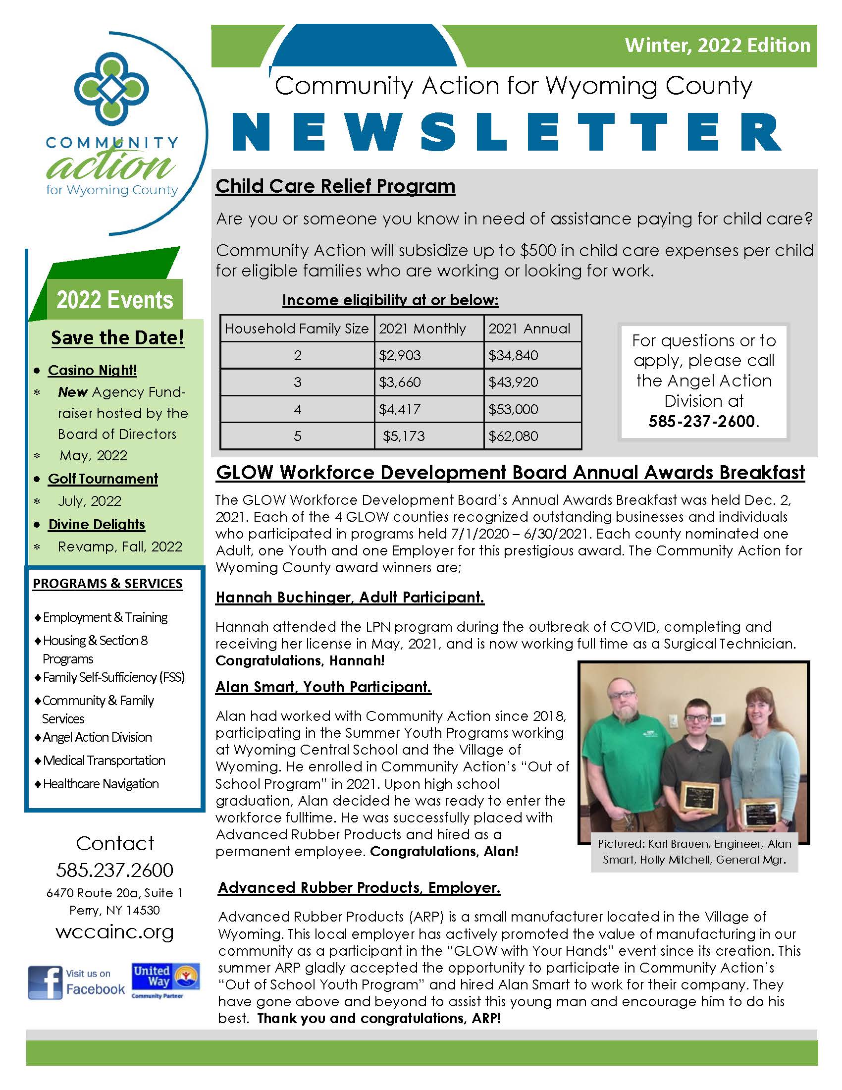 Community Action is a non-profit organization incorporated in 1995 to fight the causes of poverty by providing a variety of services and advocacy for Wyoming County residents. However, many people are unaware of what these services consist of. Keeping up with our newsletter will help showcase the incredible programs our Divisions have to offer and all of the good that is being done in our local community.
