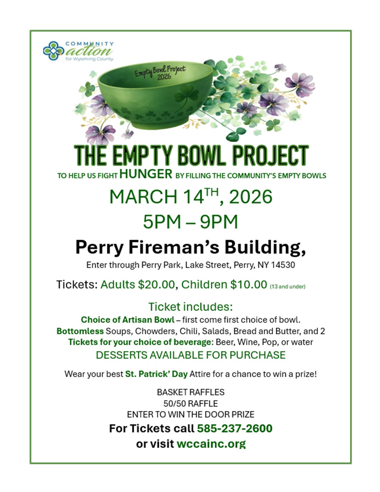 Tickets on sale now! Go to https://ticketstripe.com/2026emptybowlproject or call 585-237-2600. Tickets are also available to purchase in person at the Country Kitchen (PERRY), Pizanos (WARSAW) and Heavy Evy's (CASTILE)